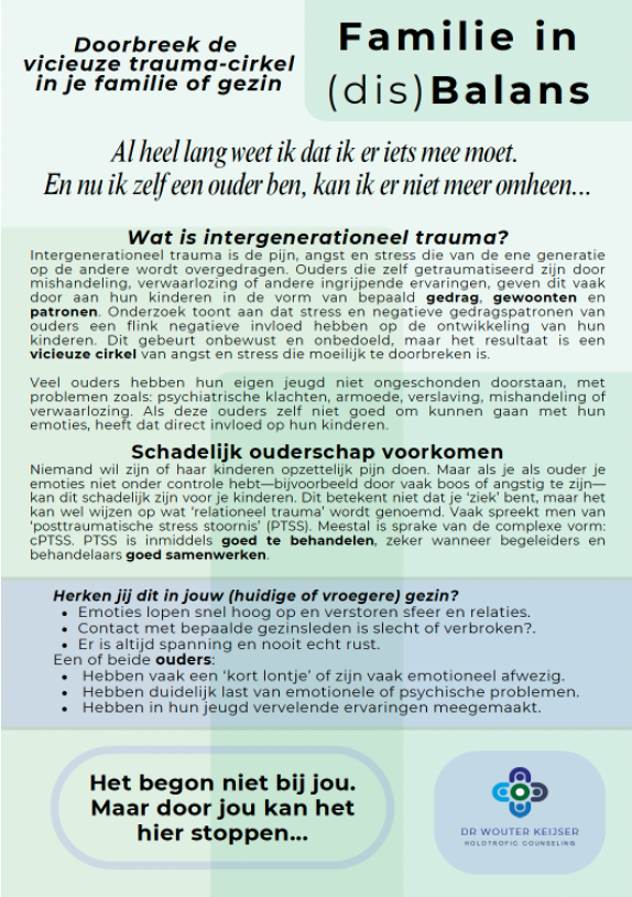 Veel klachten en problemen die onze cliënten in hun volwassen leven ondervinden, hebben op een of andere wijze te maken met het gezin waarin zij opgroeiden. Families kunnen zelfs kampen met zogenaamde 'intergenerationeel trauma'. Het gedrag van (groot)ouders die door vervelende ervaringen eerder in hun leven ontstond, wordt steeds van de ene op de andere generatie doorgegeven. Dat is altijd zonder dat ook maar iemand dit wil. Dit werkt over de generaties heen en leidt soms tot levenslang verdriet, problemen en klachten: soms met langdurig contactverlies en zelfs oudervervreemding als resultaat.